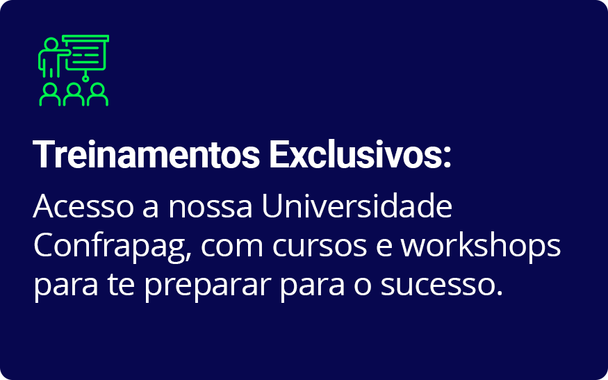 Ao se tornar um licenciado Confrapag, você terá acesso a um ecossistema completo de suporte, tecnologia de ponta e treinamentos especializados para alavancar seus resultados.